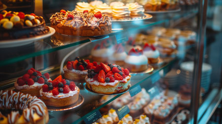 A display of delicious pastries and cakes topped with fresh berries and cream, showcased in a bakery glass case, creating an inviting scene perfect for food and dessert themes.