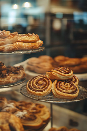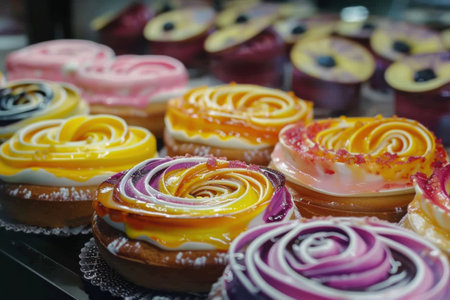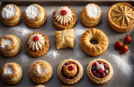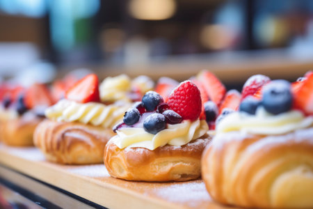 A tempting array of freshly baked pastries, featuring vibrant glazes and flaky textures, ideal for dessert lovers and food enthusiasts in a cozy bakery setting.