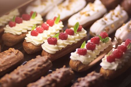 Delicious puffy chocolate eclair and strawberry tart in patisserie store