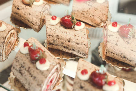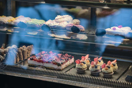 Fragment of a bakery showcase, close up. Various types of pastries behind the glass showcase