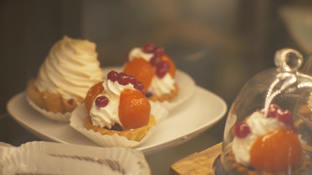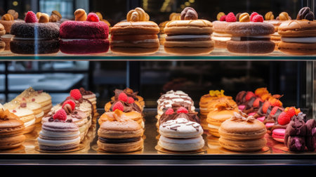 Close-up of fresh and beautiful french pastries in a bakery showcase