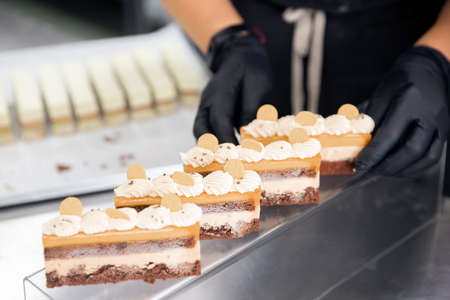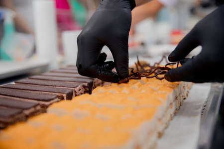 Close-up of chef hands preparing cakes and desserts covered with chocolate glaze