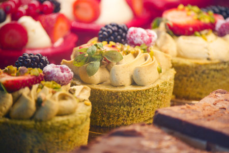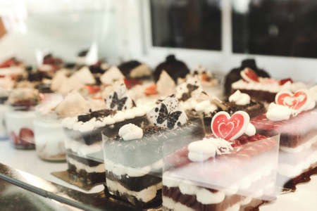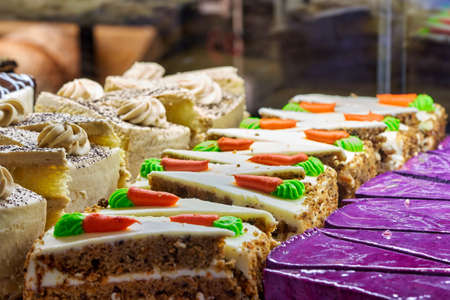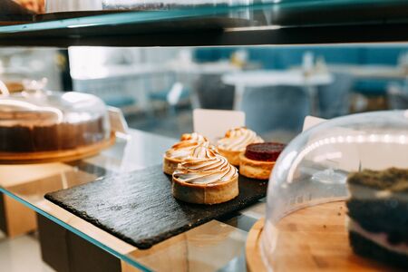 Different sweet cakes in bakery cafe close up. Confectionery cakes in candy shop
