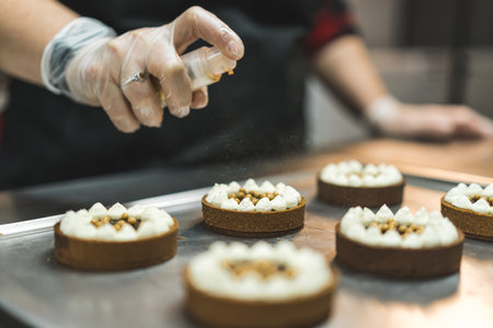 Professional female baker wearing gloves and black apron spraying golden edible glitter onto mini dessert chocolate tarts. Baking process. Decorating. Horizontal indoor close-up shot. High quality photo