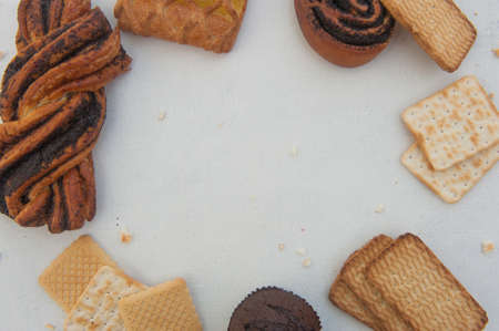 Top view of dessert table Bakery. Baking Bakery with berry jam, almond and poppy seeds. Bread, egg dessert, buns and croissants.