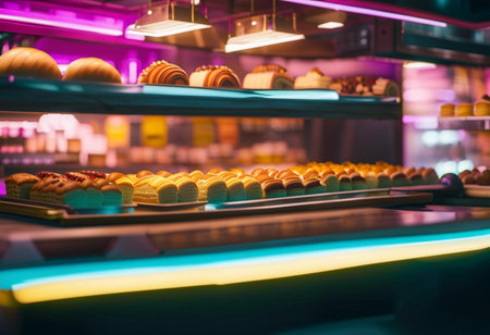 An AI generated illustration of A colorful display of cakes on a table, illuminated by a bright neon light in the background