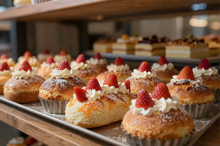 Freshly baked buns with cream and strawberries on a shelf in a bakery