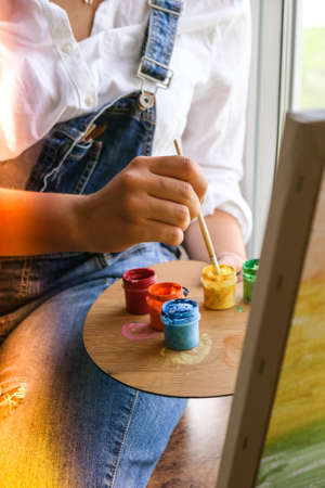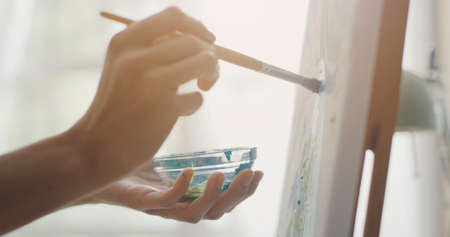 Painting with oil paints, close-up of female hand holding paintbrush