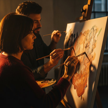 A creative workshop where people are immersed in painting, the vibrant colors and focused expressions underscoring the therapeutic benefits of art.