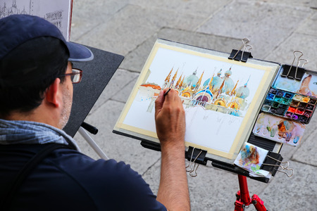 Man painting Basilica of Saint Mark at Piazza San Marco in Venice, Italy. Venice is one of the most important tourist destinations in the world for its celebrated art and architecture