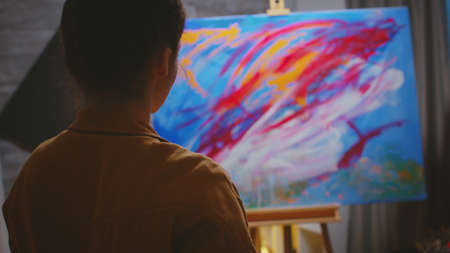 Successful artist working peacefully on masterpiece painting. Modern artwork paint on canvas, creative, contemporary and successful fine art artist drawing masterpiece
