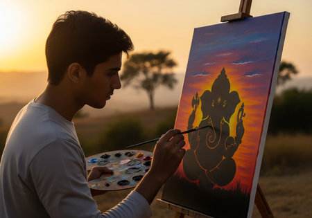 A young man intently paints a vibrant depiction of a Hindu deity against a warm sunset backdrop, capturing a moment of artistic expression and cultural reverence.