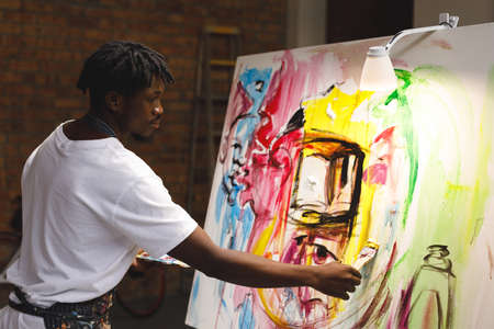 African american male painter at work painting on canvas in art studio. creation and inspiration at an artists painting studio.