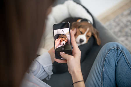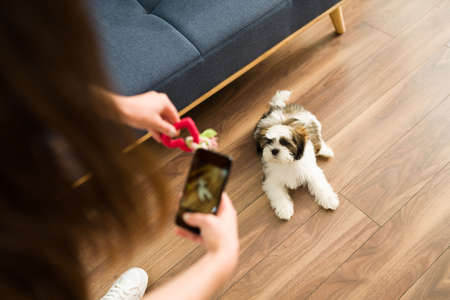 You look so cute. Loving pet owner taking a picture of her new adorable shih tzu puppy with her smartphone while showing it a dog toy