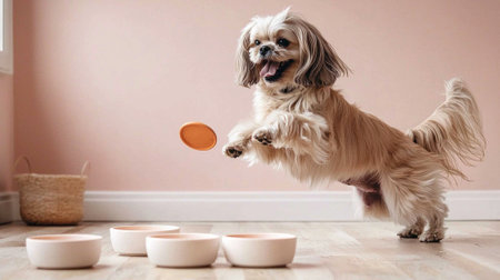Lhasa Apso long flowing fur jumps excitedly snatch orange frisbee. Its playful expression brings warmth and joy soft pink background.