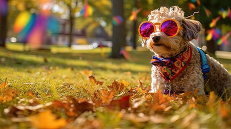 a dog wearing sunglasses and sitting in the grass with fall leaves surrounding himbree park, new york, ny