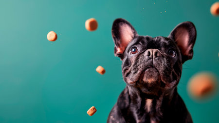 A cheerful French bulldog sits with a delighted expression, eagerly gazing at treats falling in front of him, surrounded by a colorful backdrop that enhances his joyful demeanor.