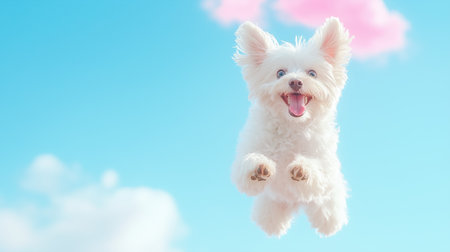 joyful white dog leaps playfully against bright blue sky, embodying happiness and energy. Its fluffy fur and excited expression create delightful scene.