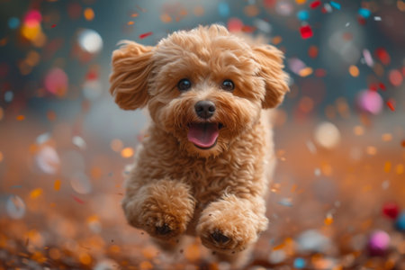 AI Generated. Cute fluffy dog with a joyful expression in a colorful background setting