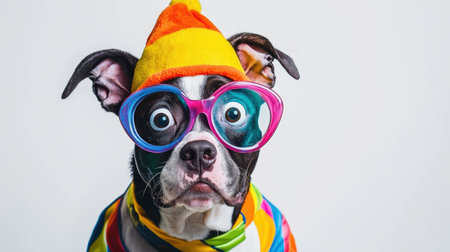 A cheerful dog wearing a vibrant costume and oversized glasses captures attention with its playful expression in a bright indoor space filled with joy.
