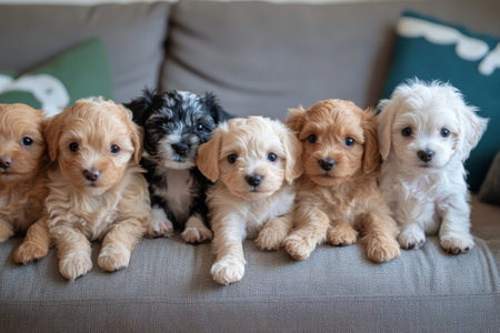 Eight playful puppies rest on a sofa, their fur varying in shades of brown and white. Soft sunlight filters through the window, creating a serene atmosphere.