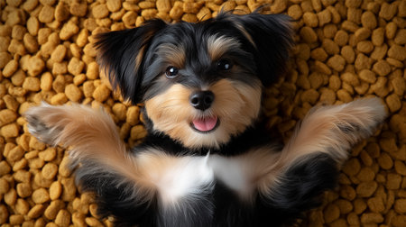 Dog lays on kibble with joyful expression, looking up at camera. Soft golden food surrounding playful pup in a warm indoor setting. Concept of pet care, dog food, animal happiness.