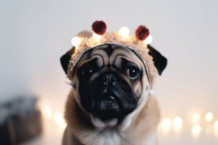 Pug wearing Christmas antlers and festive lights, looking serious with a blurred background
