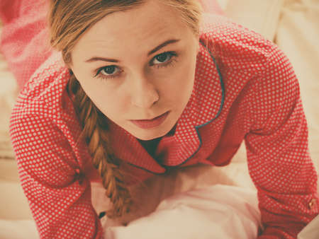 Sad woman in pajamas sitting on bed struggling with depression and mental health issues