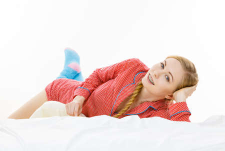 Laziness relax concept. Smiling positive teen girl in bed. Lazy youthful female wearing red dotted pajamas blue cozy socks lying on pillow in good mood.