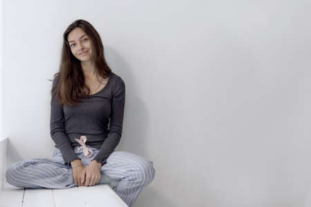 beautiful girl of European appearance sitting in my pajamas on the white wooden steps in front of a white wall. She Looks at the camera and smiles