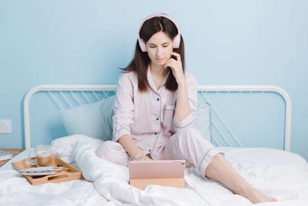 Young cute brunette woman sitting in bedroom in pajamas enjoying breakfast in bed surfing in internet wearing headphones. Girl watches webinar using digital tablet. E-dating social network consept