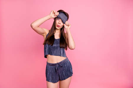 Sleep bedroom accessories concept. Sleepy woman wearing pink eye band and pajamas.