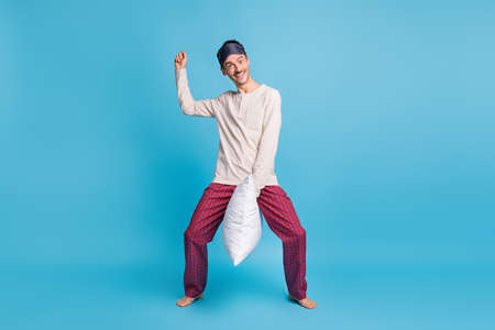 Photo portrait full body view of funny guy riding pillow isolated on vivid blue colored background
