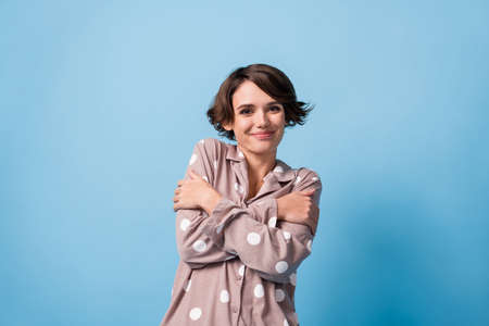Photo of young girl happy positive smile embrace herself comfort cozy isolated over blue color background
