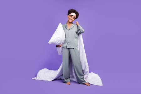 Photo of shiny sweet funny woman grey sleepwear holding pillow blanket smiling isolated violet color background