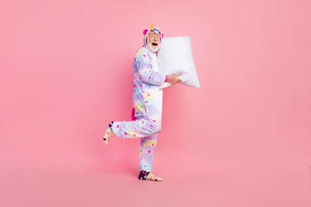 Full length body size photo girl wearing unicorn pajama walking keeping tail isolated vivid yellow color background
