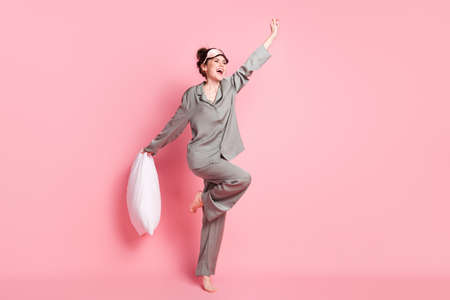 Photo of funky lucky wavy dark skin lady dotted sleepwear jumping high holding white pillow rising fist isolated pink color background