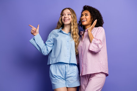Two young women in pajamas posing joyfully against a violet background, showcasing friendship, happiness, and casual lifestyle