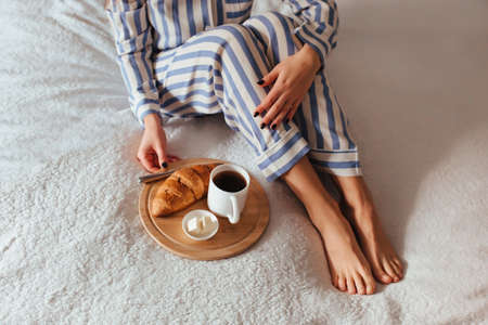 women's beautiful legs in pajamas and next to a coffee with a croissant.the concept of coffee in bed. top view