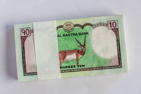 50 Nepalese rupees bills lies in different order isolated on white. Local banking or money making concept. Business background banner
