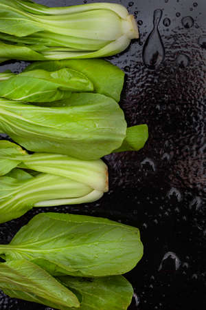 Freshly washed raw Bok choy on black table with water droplets