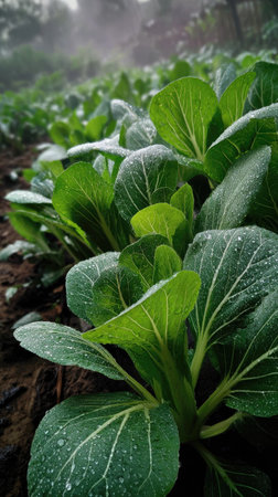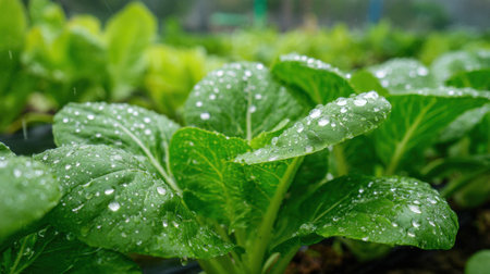 Bok choy in gentle light rain, soft raindrops visible on vivid green leaves, natural realistic style, bright fresh colors, balanced wide composition, cinematic framing, highly detailed.