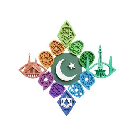 A colorful illustration of Pakistan's cultural symbols and national flag