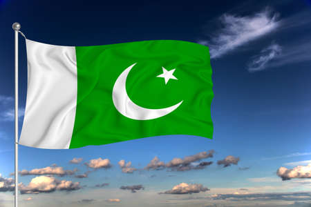 Pakistan flag waving in the wind against blue sky with white clouds 3D illustration