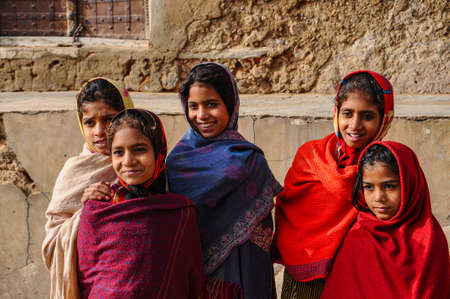 Mandawa, India - Dec 29, 2019: Unidentified indian women with her colorful scarf. Scarf made of indian silk is very common and popular among Indian woman.