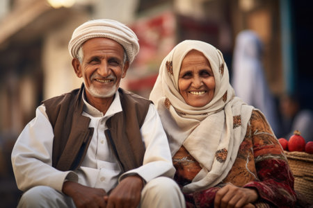 A Yemen elderly couple sitting on a street in the middle of an alley, AI