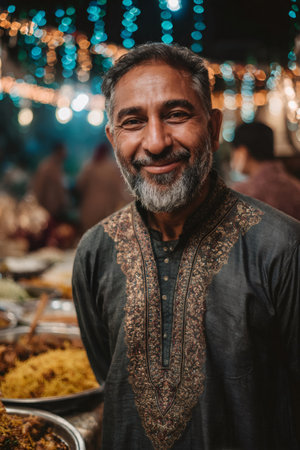 Cheerful mature Pakistani food vendor smiling at a night market with bokeh lights