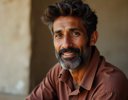 A resident of Afghanistan, this smiling man radiates warmth and happiness, displaying a rich cultural heritage while embracing life. His genuine expression reflects the beauty of his surroundings. AI.