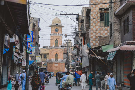 Peshawar, Pakistan - July 20, 2021: Daily life of the crowded Pakistan city center with the Buildings and Rickshaws