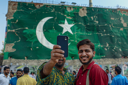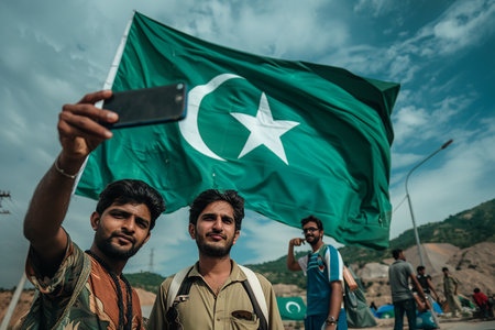 Generative AI Image of Two Pakistani Man Taking Photo on Pakistan Flag Background